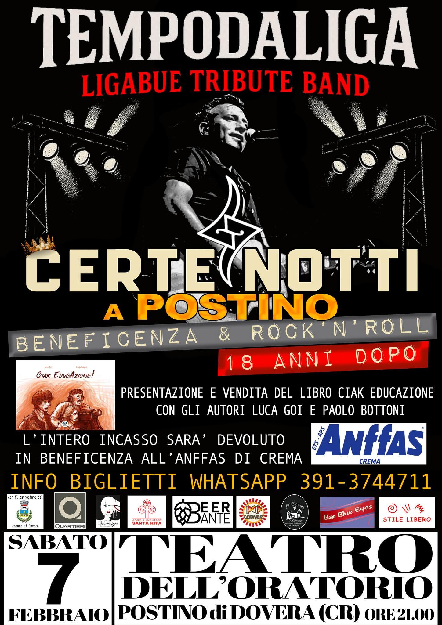 Sabato 7 Febbraio 2026 alle ore 21:00 presso il Teatro dell’oratorio di Postino, avrà luogo il concerto di beneficenza “Certe Notti a Postino” organizzato dalla Ligabue Tribute Band “TEMPODALIGA”.