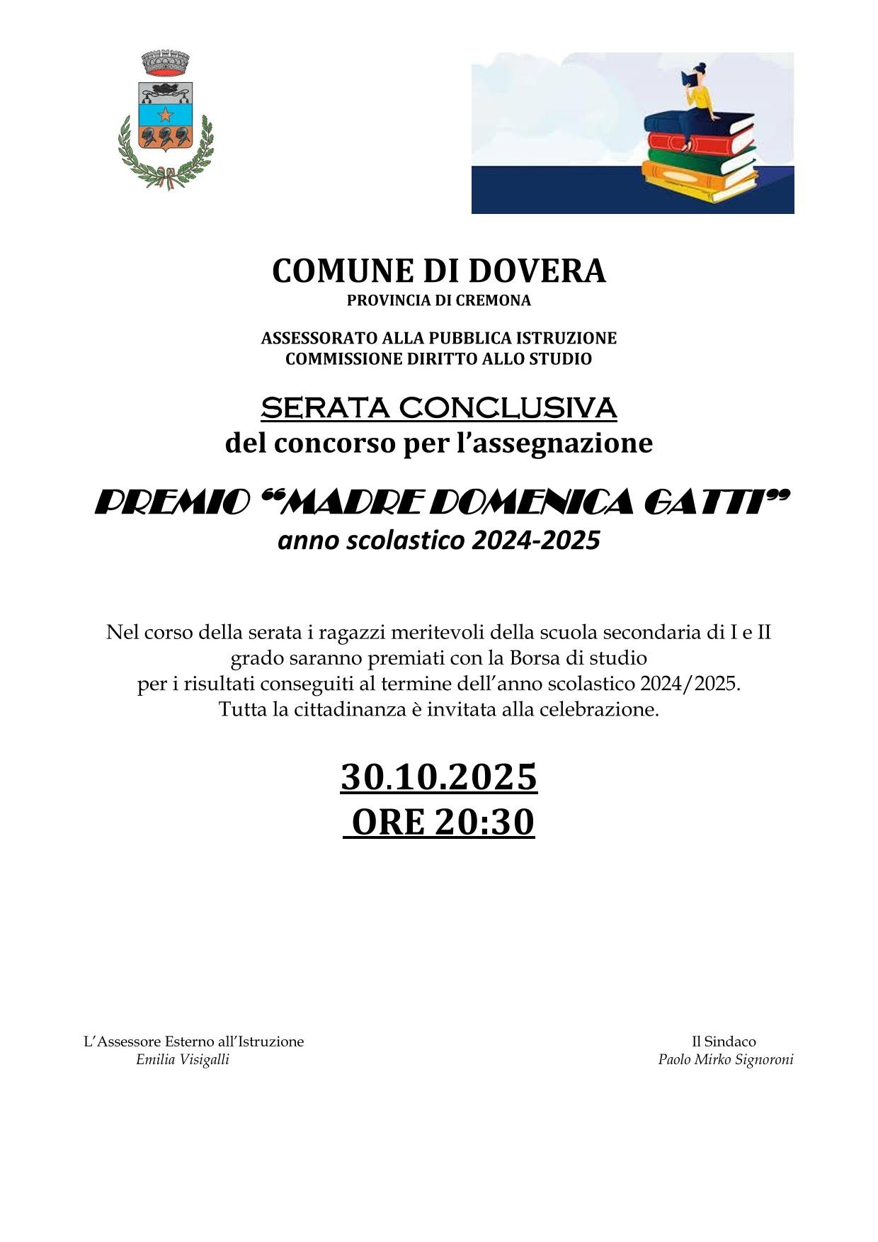 Giovedì 30 Ottobre 2025 alle ore 20.30 presso la Sala Consigliare del Municipio ci sarà l’assegnazione del Premio “Madre Domenica Gatti” conferito agli studenti ed alle studentesse del nostro territorio per il brillante risultato conseguito nell’a.s. 2024/2025.