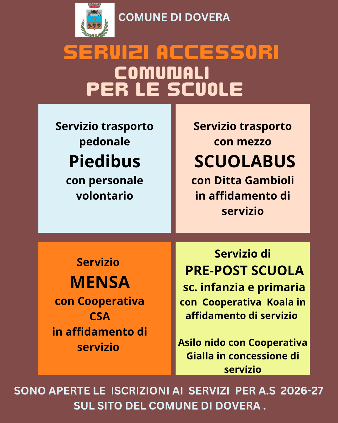 Si avvisano i genitori degli alunni che intendono usufruire per l’a.s. 26/27 dei servizi piedibus, scuolabus, pre-post scuola di prendere visione delle nuove modalità d’iscrizione attraverso l’avviso allegato.