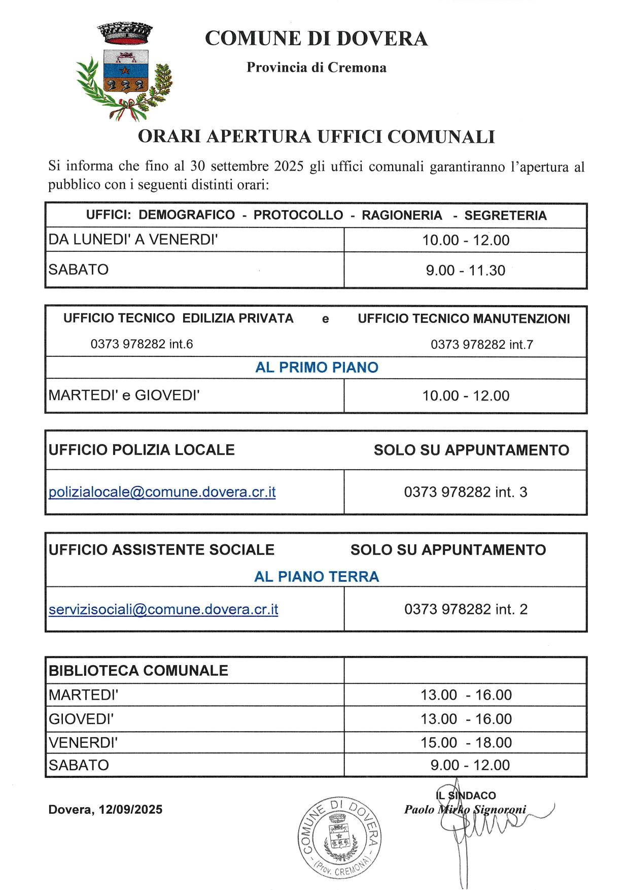 Descrizione Per corsi di aggiornamento del personale si rende necessaria la chiusura pomeridiana degli uffici. In allegato gli orari validi fino al 30/09/2025