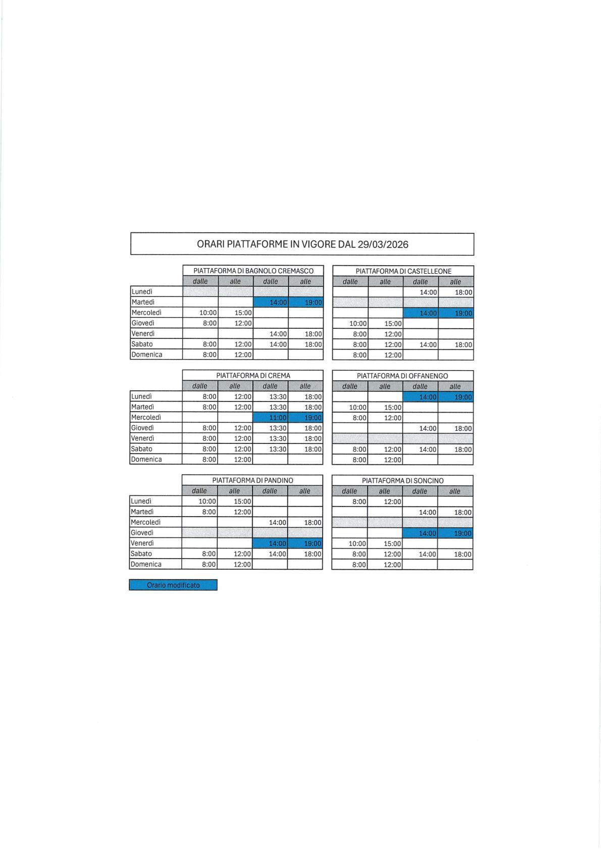 Si pubblica orario delle piattaforme in vigore dal 29.03.2026